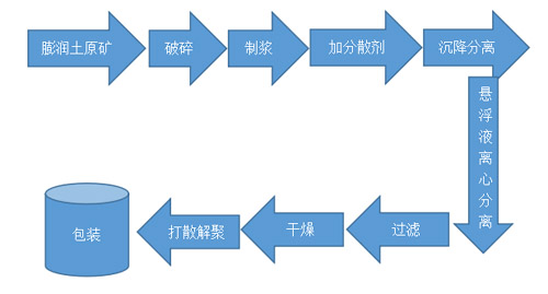 對于膨潤土原礦蒙脫石含量較低(30%-80%)的低品位膨潤土或含長石、石英的粒度教習的膨潤土,要想獲得更高的純度的膨潤土或蒙脫石,往往采用濕法提純方法。工藝流程如下: